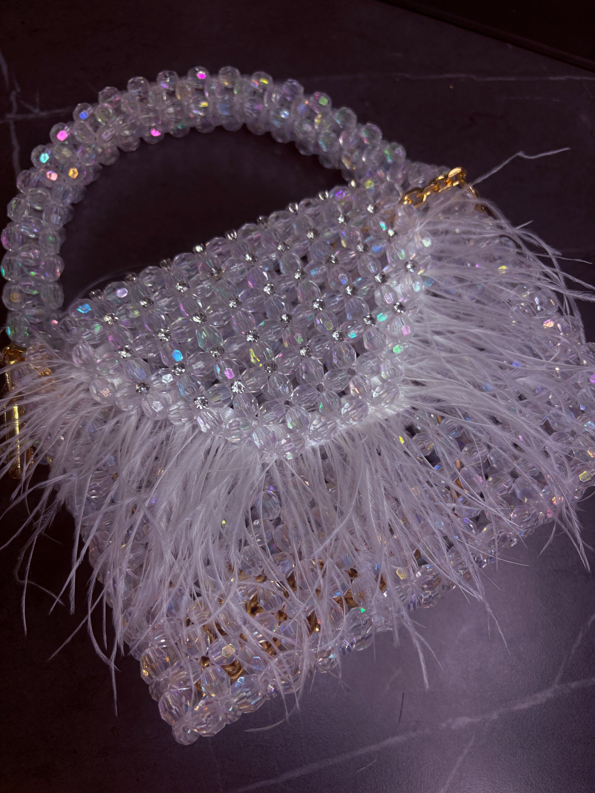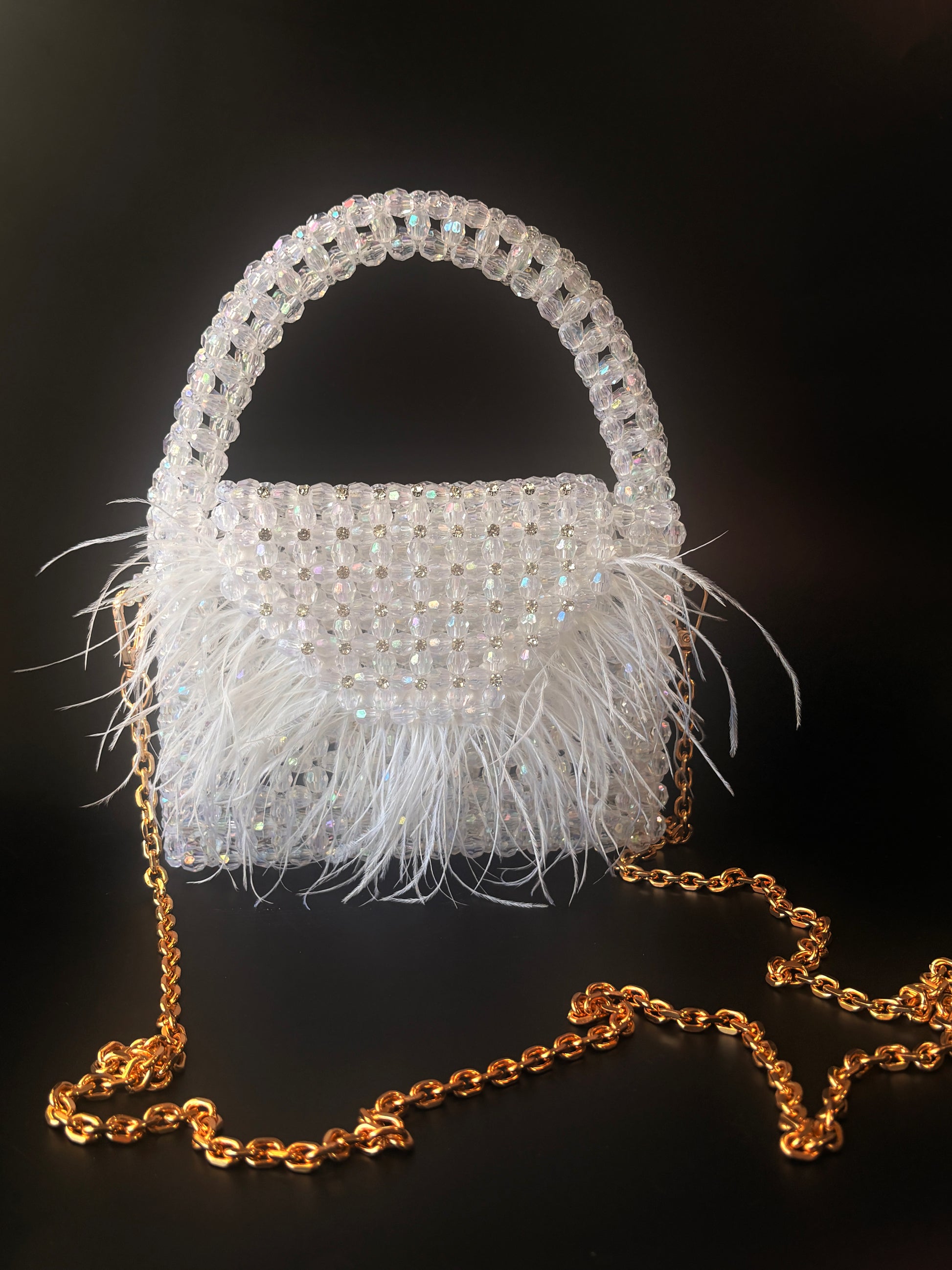 Descubre la sofisticación de este bolso blanco de diseño artesanal, adornado con delicadas plumas blancas y un sutil acabado brillante que aporta un toque de glamour único. Ideal para eventos especiales, fiestas, bodas o noches elegantes, este bolso se convierte en el accesorio perfecto para realzar cualquier look.