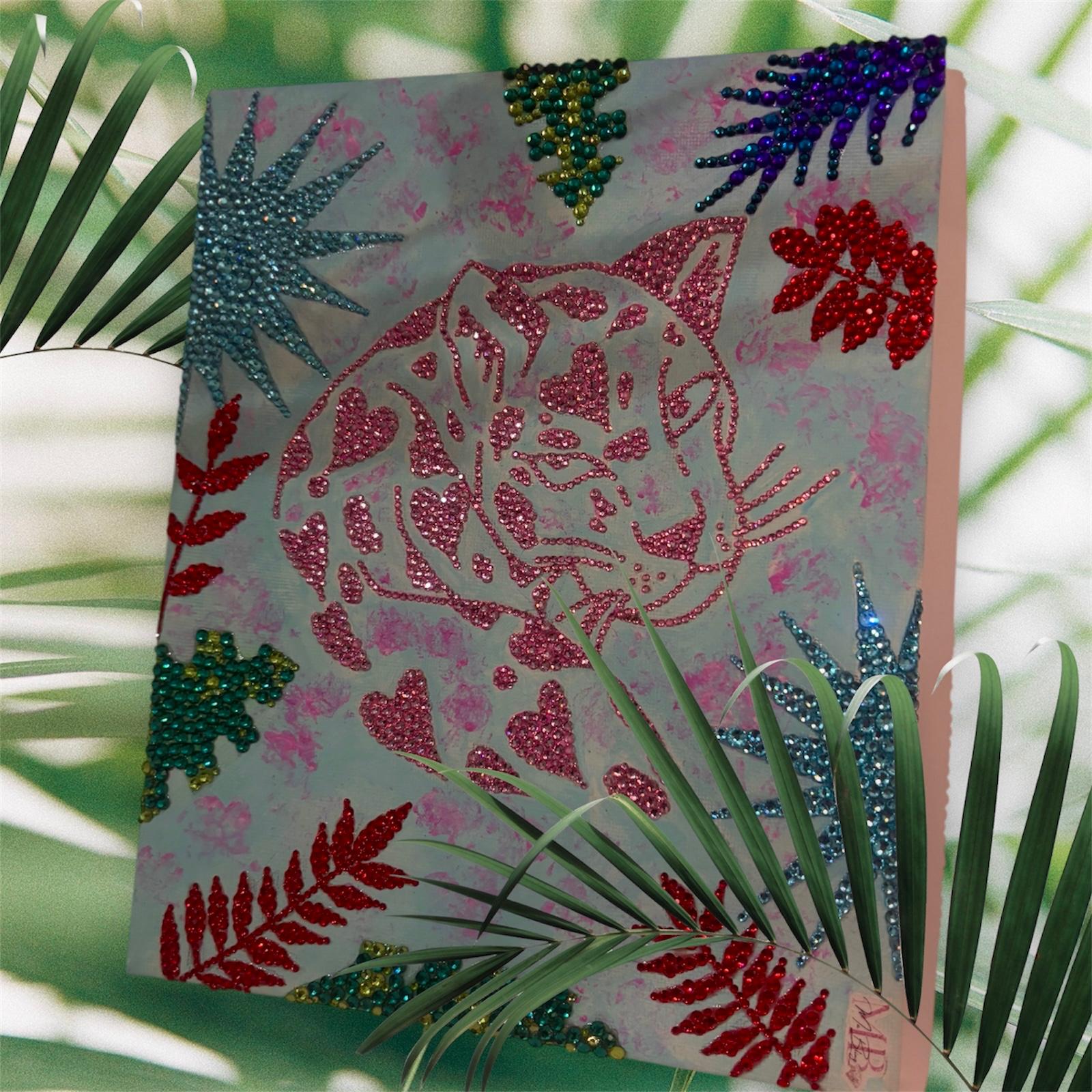 Descubre el encanto vibrante de nuestro cuadro exclusivo "Fuerza Salvaje en Brillos", una obra artesanal de 25 x 20 cm ideal para dar vida y personalidad a cualquier espacio. Esta pieza única presenta la silueta de un felino en tonos rosados brillantes, rodeada de hojas tropicales en colores intensos y luminosos, todo realizado con pedrería brillante que resalta con cada rayo de luz. Perfecto para habitaciones juveniles, rincones creativos o para regalar a quienes aman el arte con carácter y glamour. Hecho a mano con amor por MaBling 💖